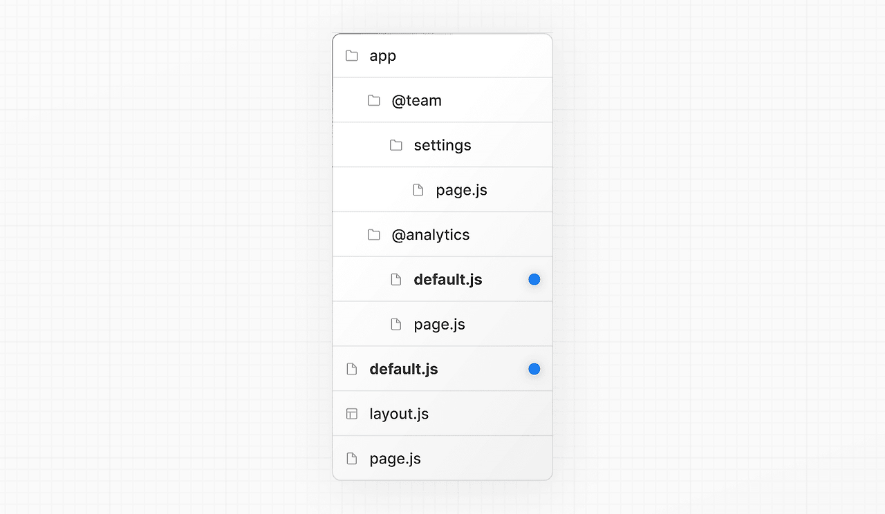 위와 같이 있는 경우에 @analyics 폴더 안에 page.tsx가 존재하지 않기 때문에, 이런 경우 default.js 파일이 렌더링되는 것이다.