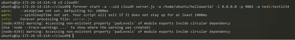 $> forever start -a --uid cloud9 server.js -w /home/ubuntu/helloworld/ -l 0.0.0.0 -p 9002 -a test:test1234