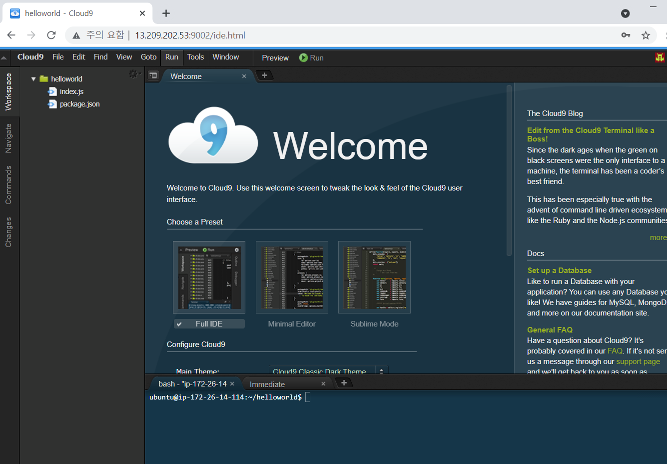 여기에 설정해준 이름과 비밀번호를 입력하면 다음과 같이 cloud9 개발 환경이 나온다.