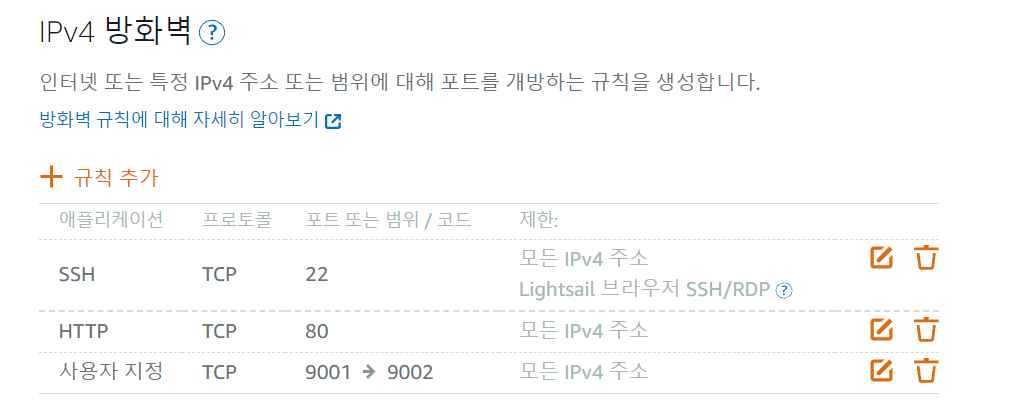 Lightsail에 접속하여 방화벽 설정 페이지로 들어가 Cloud9용 포트를 열어준다.